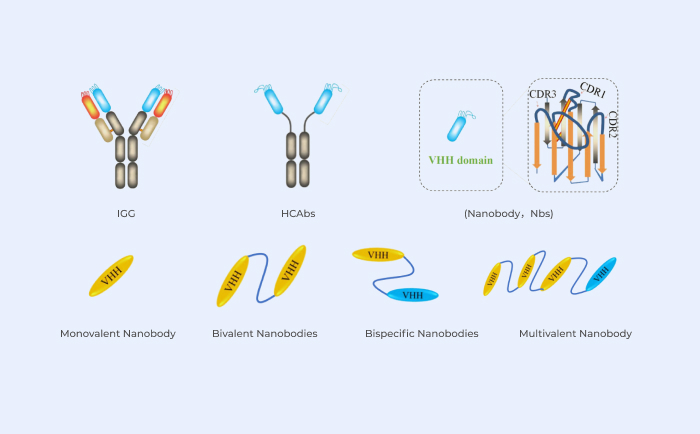 納米抗體(Nanobody,Nb), 即重鏈單域抗體VHH (variable domain of heavy chain of heavy-chain antibody),是由比利時科學家于1993年在自然雜志中報道,是駱駝科動物(駱駝,大羊駝,羊駝及其近親物種)缺失輕鏈的天然重鏈抗體的可變區(qū)(VHH)組成的單域抗體,該抗體只包含一個重鏈可變區(qū)(VHH)和兩個常規(guī)的CH2與CH3區(qū)。 VHH晶體為直徑2.5nm、長4nm的圓柱體,分子量只有15 KDa,因此也被稱作納米抗體(Nanobody, Nb)。